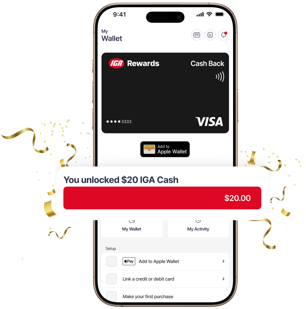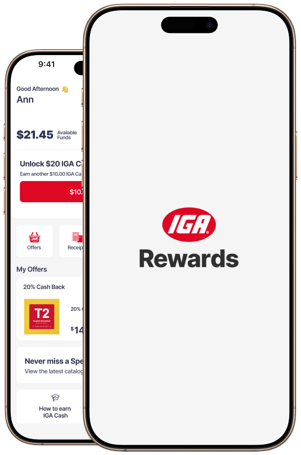 IGA Cash is accessible via a Digital IGA Rewards Visa Card once $20 IGA Cash is earned. Terms and conditions apply (see www.igarewards.com.au/terms).